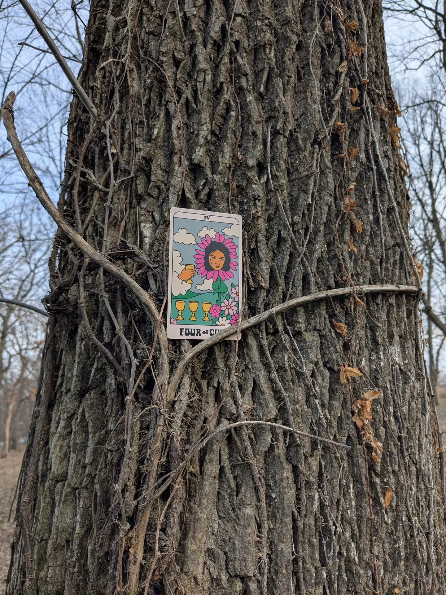 As I walk, I let my thoughts come and go. If I see something that is just cool looking or stands out, a question may come to mind that I draw a card for. Today, I took my family with me to walk in a wooded park in the late afternoon, enjoying the warm weather and the beautiful way the sunlight filtered through the branches on the trees. We recently had Winter Solstice so, with each day, we gain more sunlight. Even though the world is predominantly brown, nature is only taking time to rest and sleep before she dawns her beautiful tapestry of green leaves on the trees, green grass, and adornments of a multitude of flowers and birds. It totally makes sense that I drew the Four of Cups as I asked for the main theme or takeaway for consideration: